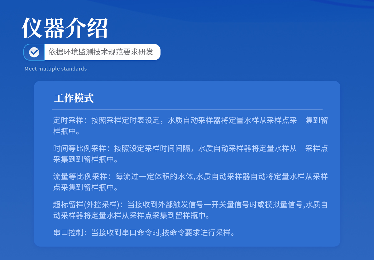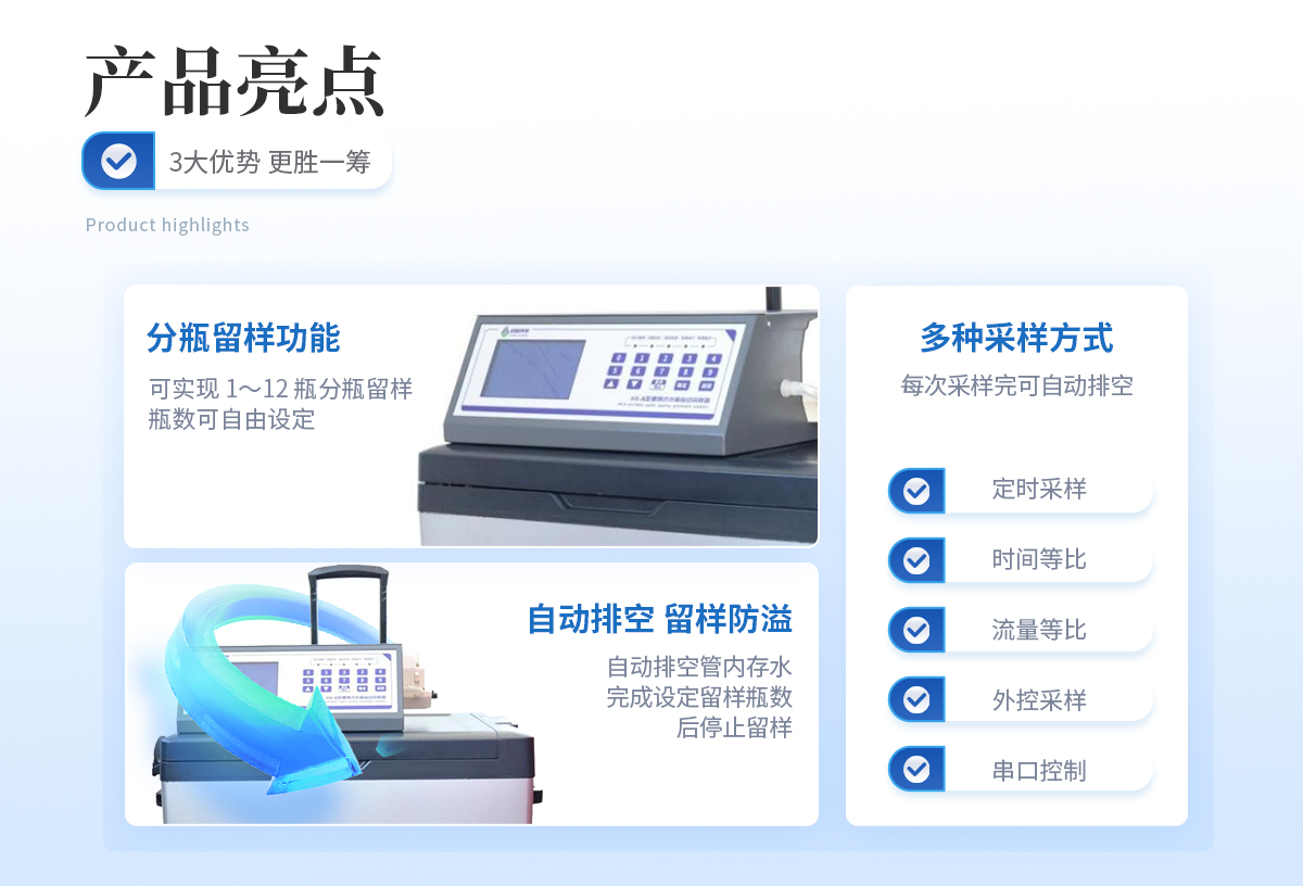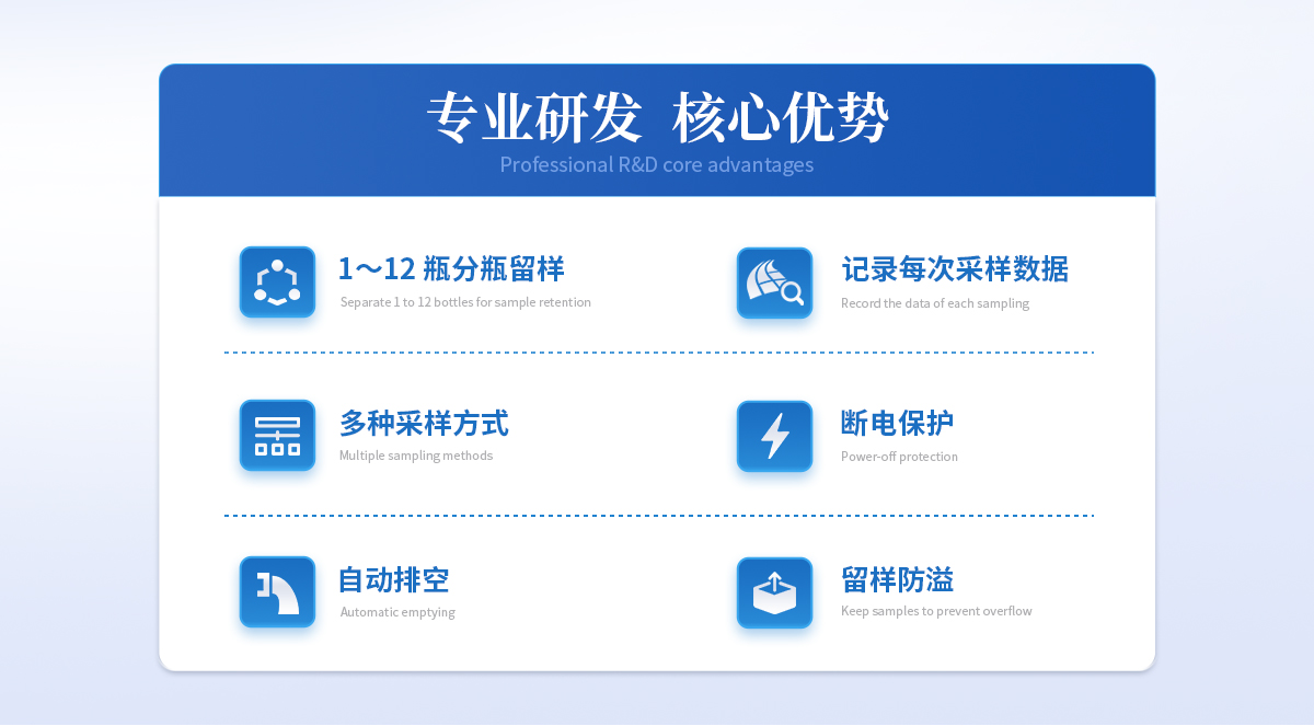 | 節(jié)能:**功率190W, 平均功率45W。 用環(huán)保的方式完成環(huán)保事業(yè)。 | 可靠:維護(hù)周期≥168h,蠕動(dòng)泵管等耗品平均使用壽命三年; | 與水接觸的所有容器均為模具加工的耐腐蝕材料; | 與水接觸或可能會(huì)意外接觸水的用電設(shè)備均為直流24V供電,更好的保護(hù)使用者; | 水樣冷藏箱物理鎖與密碼電子鎖并用,雙人雙鎖確保水樣安全; | 多種固定劑添加保障不同因子留存時(shí)間更長; | 合理的混勻桶結(jié)構(gòu),高速攪拌讓水樣混勻更完全,攪拌槳外四氟內(nèi)304鋼的結(jié)構(gòu)確保不與水 樣發(fā)生化學(xué)反應(yīng); | 智能:斷電保護(hù)功能使采樣器在因不可抗力導(dǎo)致采樣器運(yùn)行中斷電,再次上電時(shí),采樣器所設(shè)定的參數(shù)不會(huì)改變,且能夠恢復(fù)到斷電前的工作模式繼續(xù)運(yùn)行; | 簡單:安裝簡單,一人一小時(shí)既能完成一臺(tái)采樣器的現(xiàn)場安裝; |