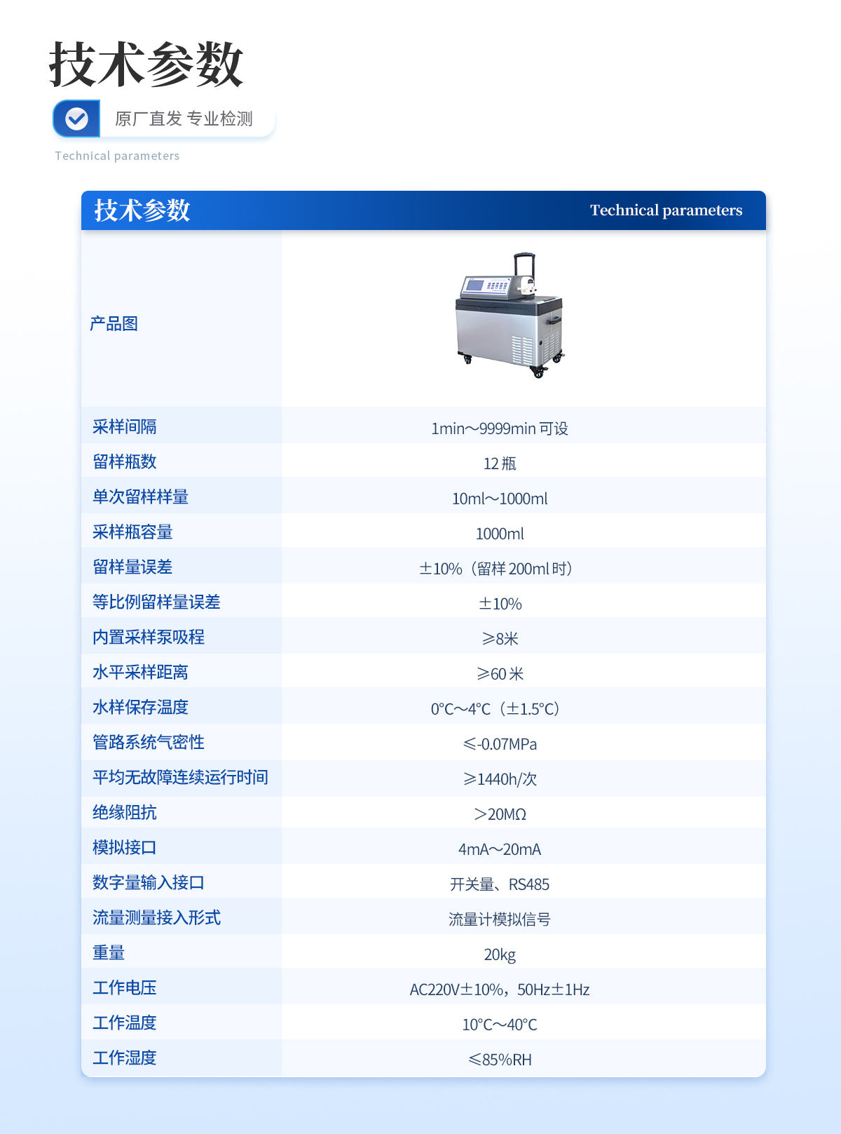 | 采樣量誤差:±5% | 等比例采樣量誤差:±10% | 留樣量誤差:±5 % | 等比例留樣量誤差:±10 % | 留樣量重復(fù)性:≤3% | 系統(tǒng)時(shí)鐘計(jì)時(shí)誤差:≤10 s/24 h | 冷藏箱溫度控制誤差:±2 ℃ | 模擬量采集誤差:±0.05 mA | 保存劑注入量誤差:±10 % | 采樣垂直高度:≥5 m | 水平采樣距離:≥50 m | 管路系統(tǒng)氣密性:≤-0.08 MPa | *小維護(hù)周期:≥168 h |